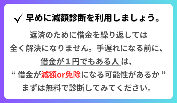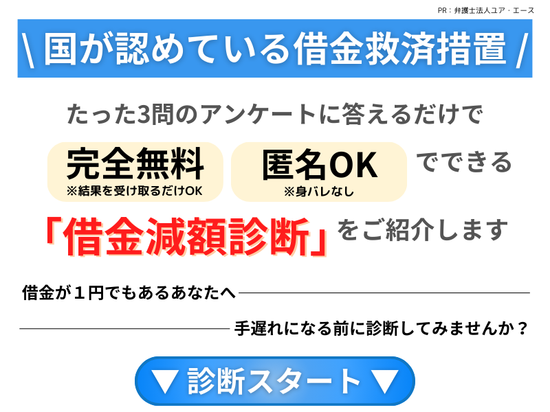 返済がパンク寸前になり、匿名でできるこちらの減額診断をやってみることにしました。専門家への依頼は抵抗がありましたが、会社にはバレたくないという希望があり差押え前に対応してもらい、結果として250万円以上あった借金が免除になったので本当に感謝しています。